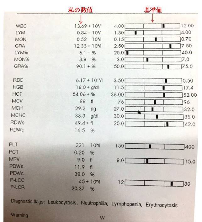そうであるならば、LYM%(リンパ球)の数値は非常に悪いと思われます。なお、この見方は私の推測ですので不正確な部分があるかもしれません。ご了承ください。