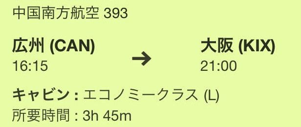 ・広州空港(中国)で乗り換えて関西空港へ