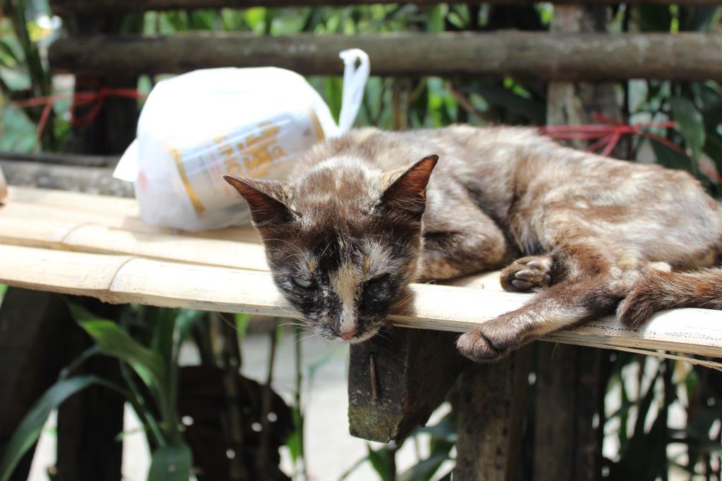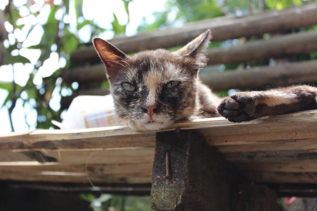 竹の小屋(部屋)を出てすぐ、猫と目が合いました。